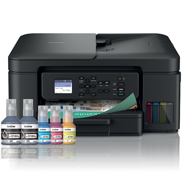 A impressora Brother Tankbenefit 3 em 1 com depósito de tinta de alta capacidade, compacta, impressão frente e verso automático e reenchimento rápido. Impressora | Copiadora | Scanner Bandeja 150 folhas - Conexão WiFi e móvel- Visor 4,5 cm com teclas - ADF 20 folhas- Inclui frascos de tinta com uma capacidade aproximada de 15.000 páginas a preto (2 x 7.500) e 5.000 páginas a cores